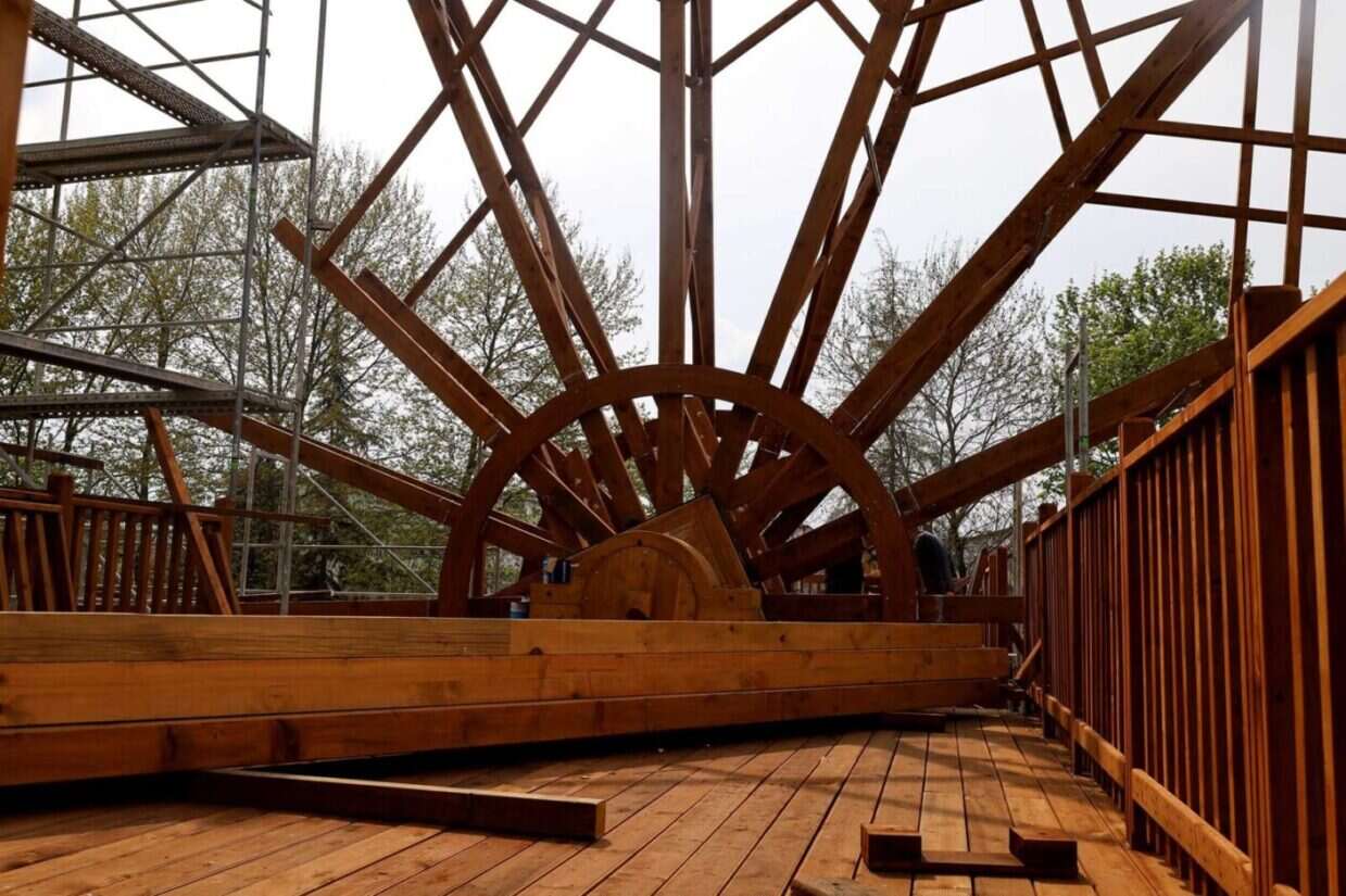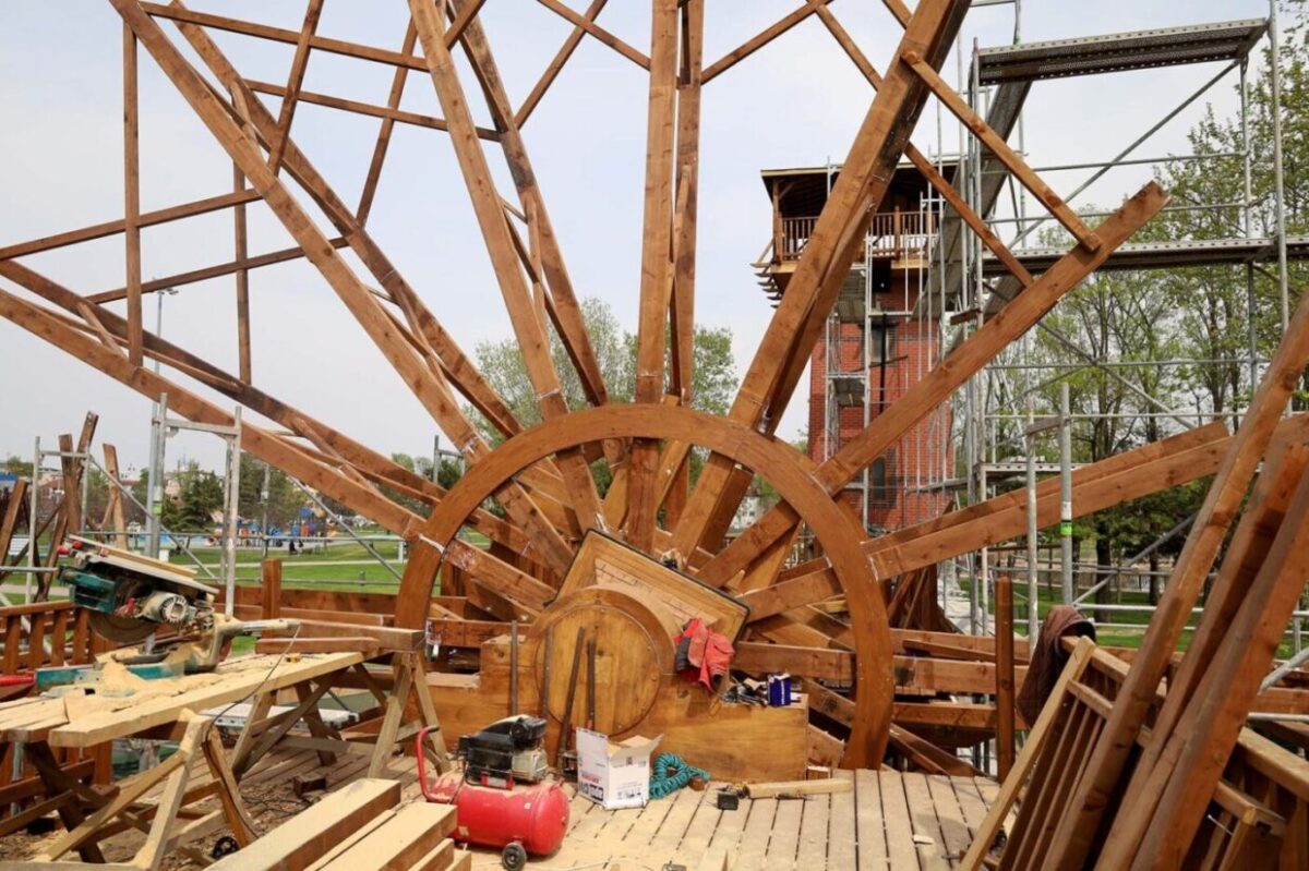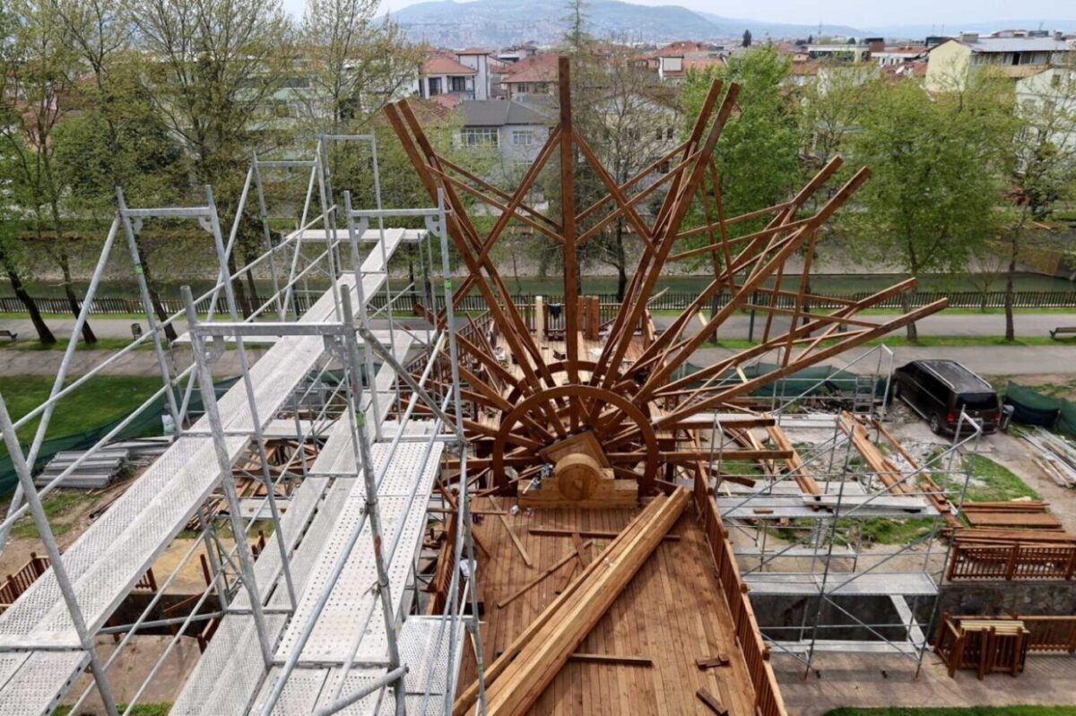Tarihi Çarkın kule bölümünde ahşap işçilik ve montaj işlemleri tamamlandı. Çarkın yeniden oluşturulmasına yönelik detaylı çalışmalar ise devam ediyor. Ayrıca dönel mekanizmanın montajı tamamlanırken, çarkın kolları ve su taşıyan bölümünün imalatı son aşamaya geldi.