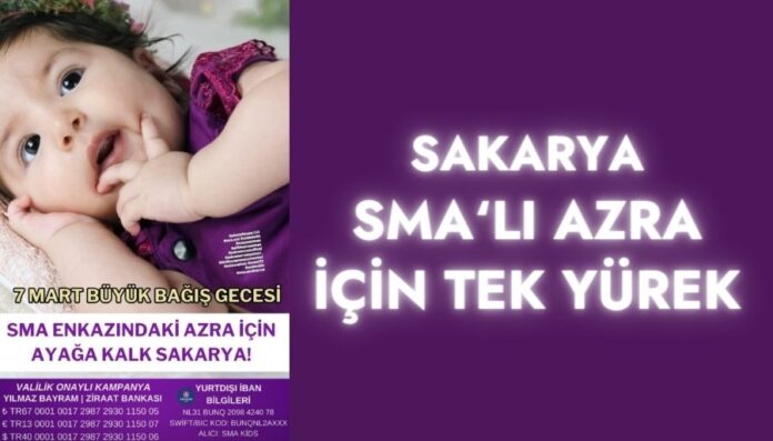 Sakarya’da faaliyet gösteren sivil toplum örgütleri, iş insanları ve hayırseverler, depremden sonra dünyaya gelen ve 13 günlükken Spinal Musküler Atrofi (SMA) hastalığı teşhisi konulan Azra için 7 Mart 2024 Perşembe günü saat 19.00’da Serdivan Belediyesi Kongre ve Kültür Merkezi’nde büyük bir bağış gecesi düzenliyor.