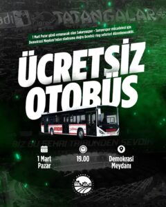 Ücretsiz ulaşım desteği, maç günü saat 19.00’dan itibaren Demokrasi Meydanı’ndan stadyuma doğru başlayacak. Taraftarlar, karşılaşma sona erdikten sonra da aynı şekilde stadyumdan Demokrasi Meydanı’na ücretsiz olarak taşınacak. Böylece hem stadyuma gidiş hem de dönüşte taraftarlara kolaylık sağlanacak.